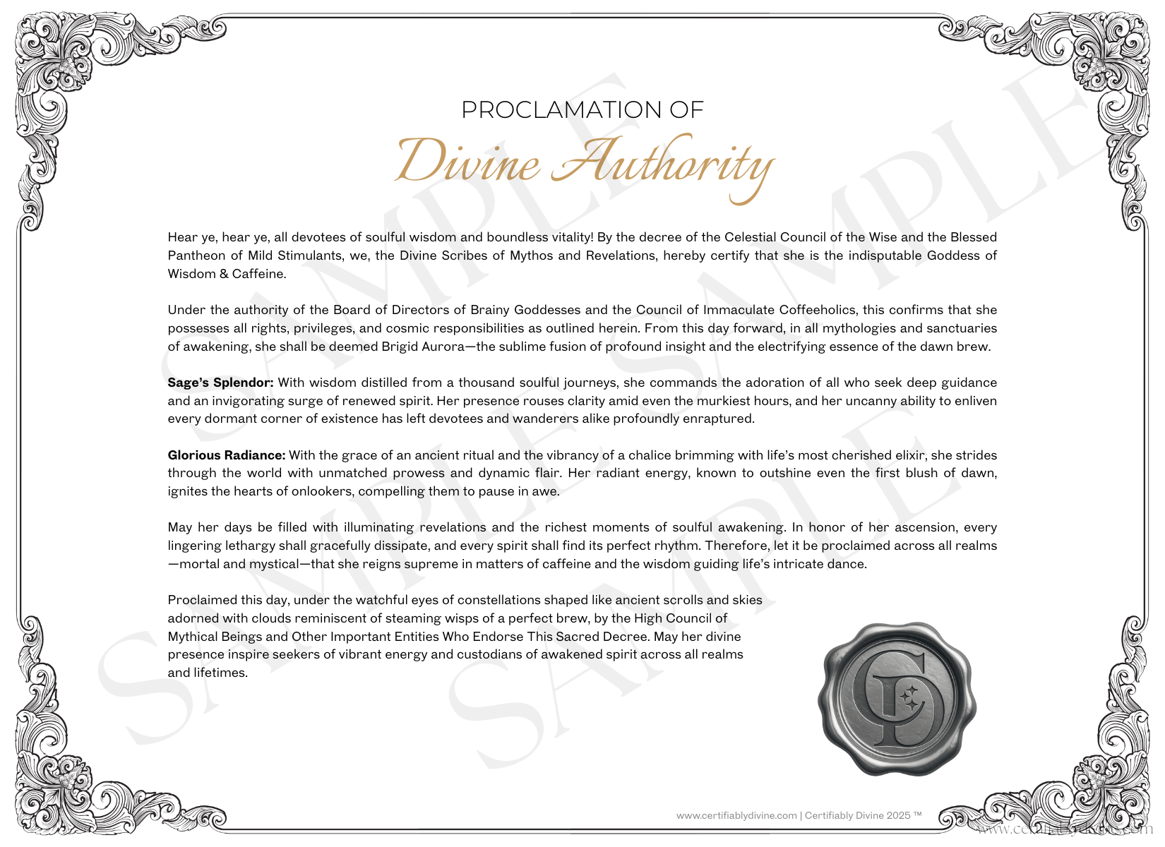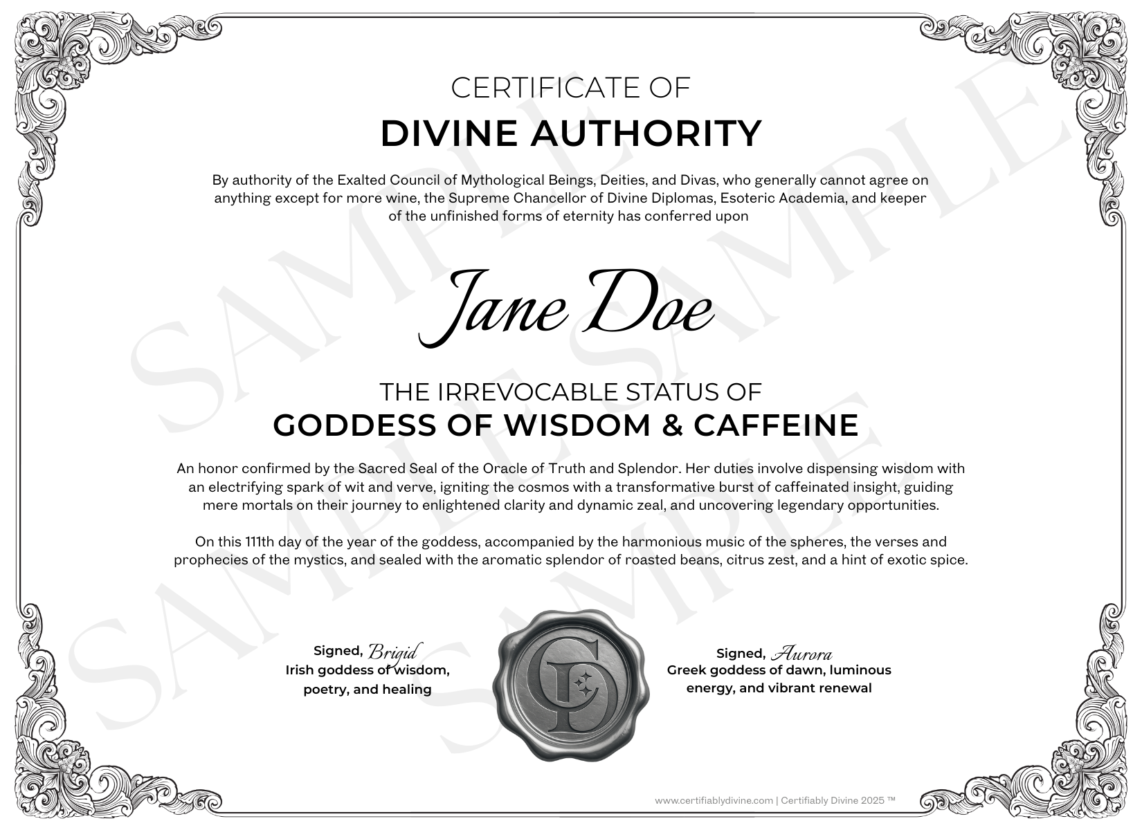 For caffeine-fueled queens who turn espresso into enlightenment. Declare your divine right to thrive (and sip). This printable certificate honors your sacred morning rituals, wise one-liners, and your unshakable belief that coffee counts as self-care.