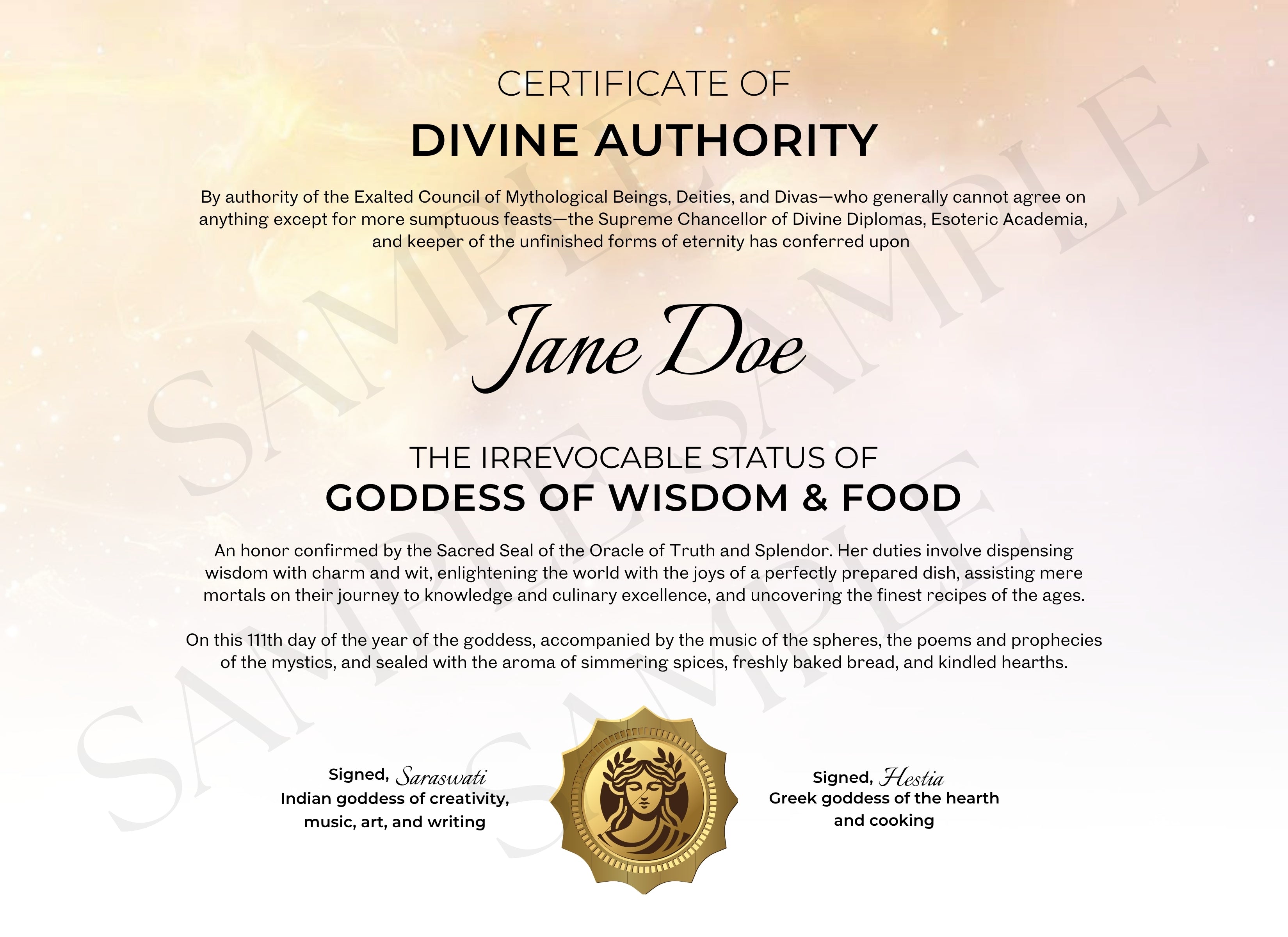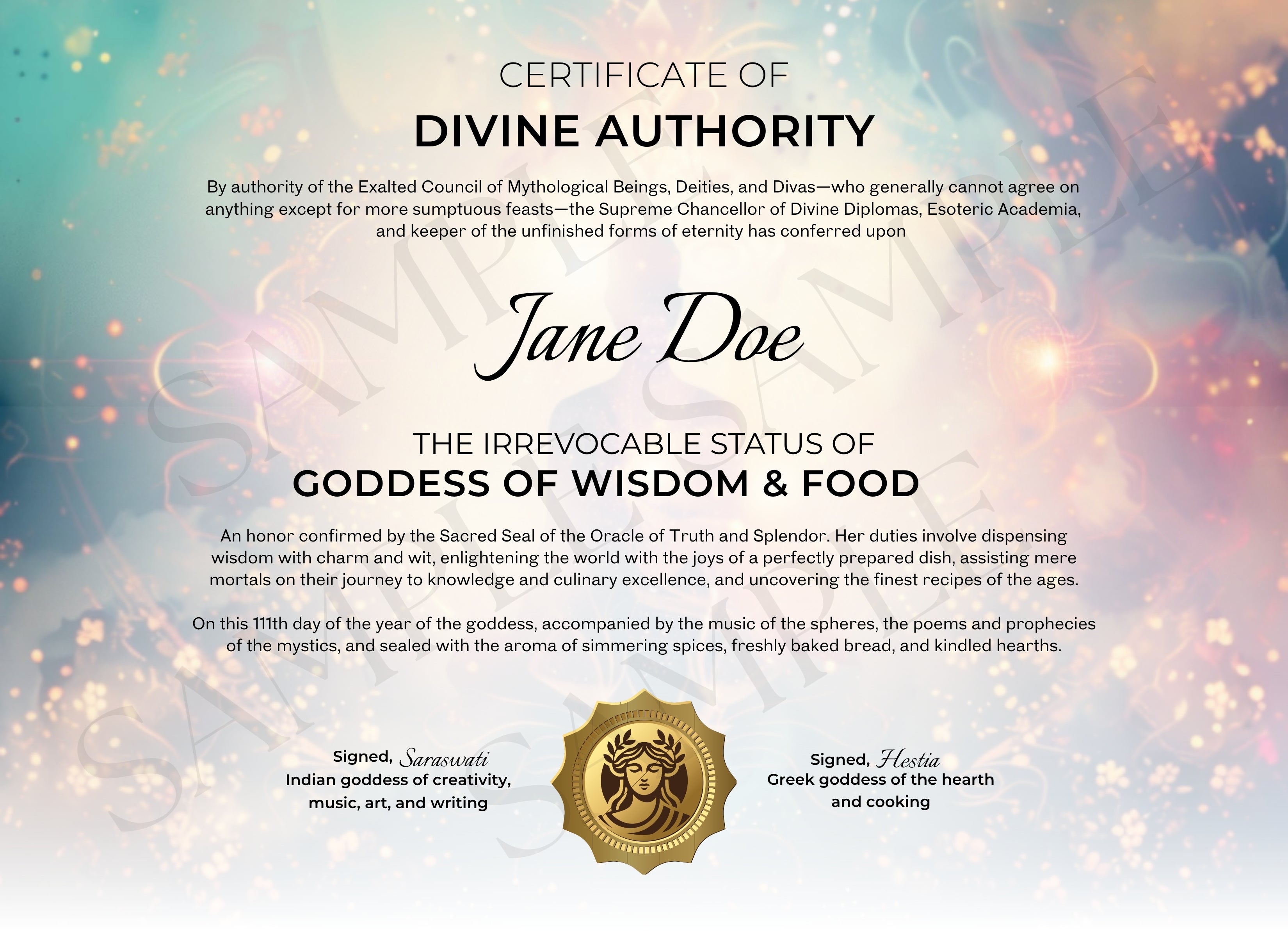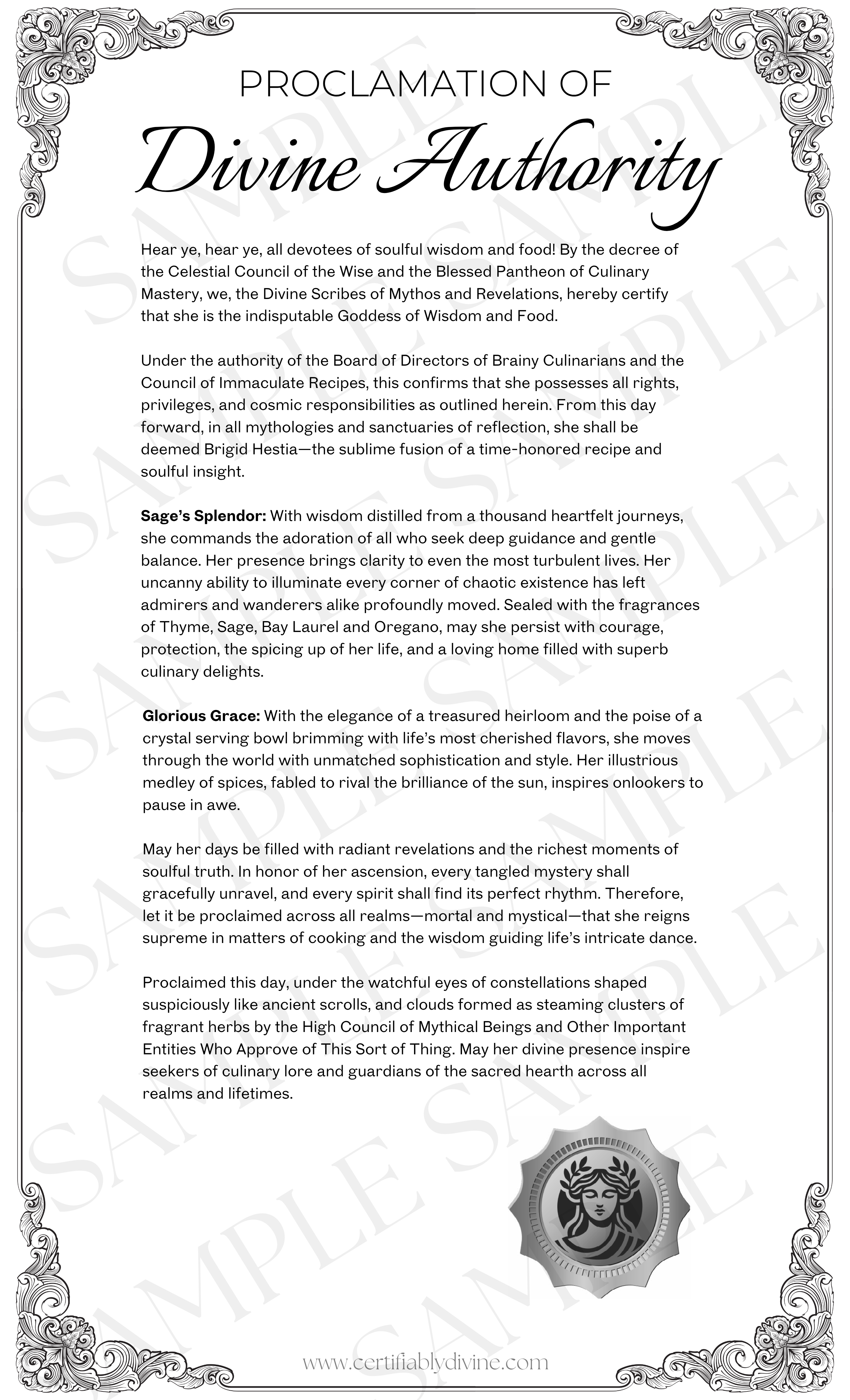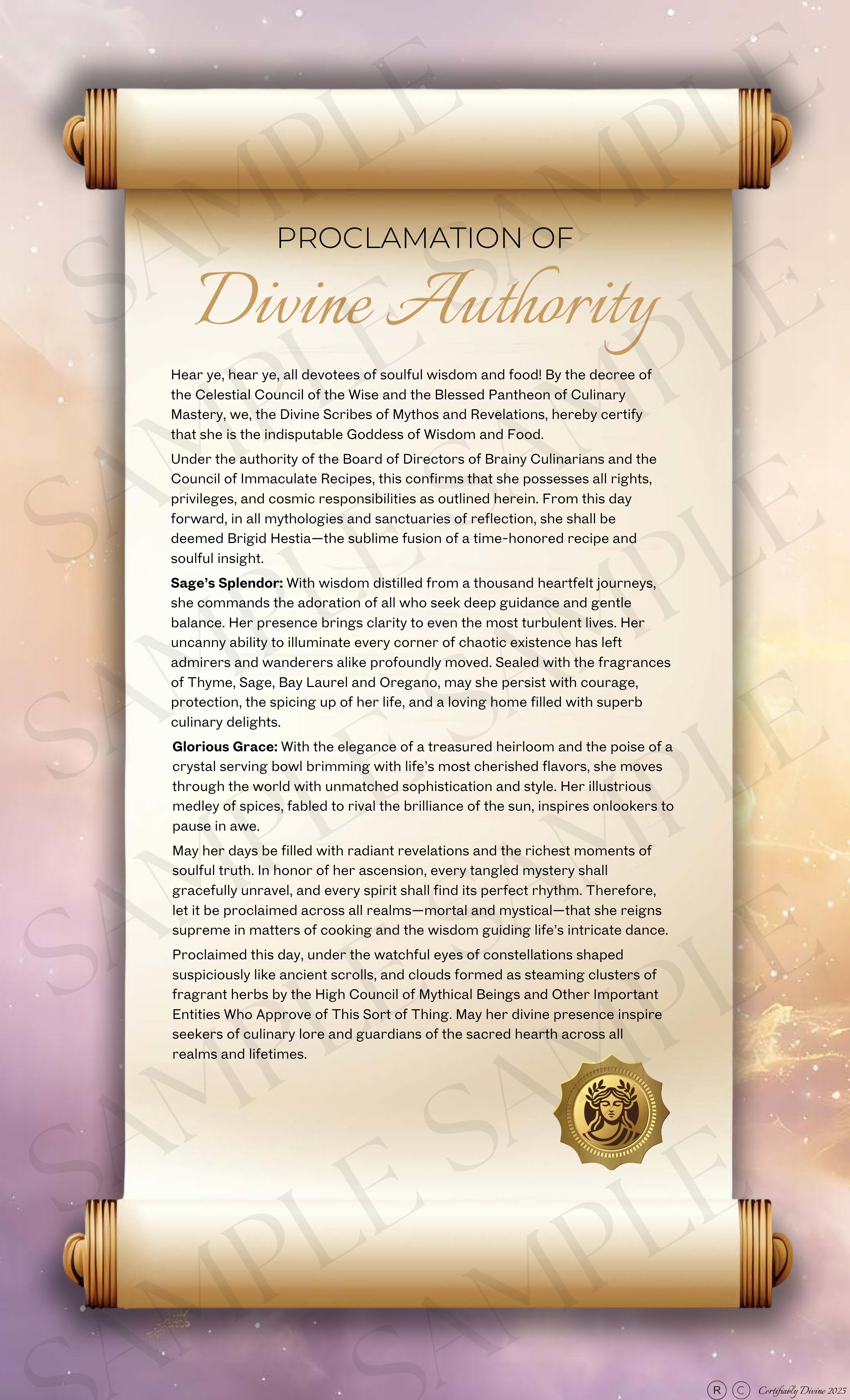 Proclaim your sacred right to feed hearts and bellies alike. This printable certificate honors your divine power in the kitchen, and your gift for turning ingredients into edible joy.