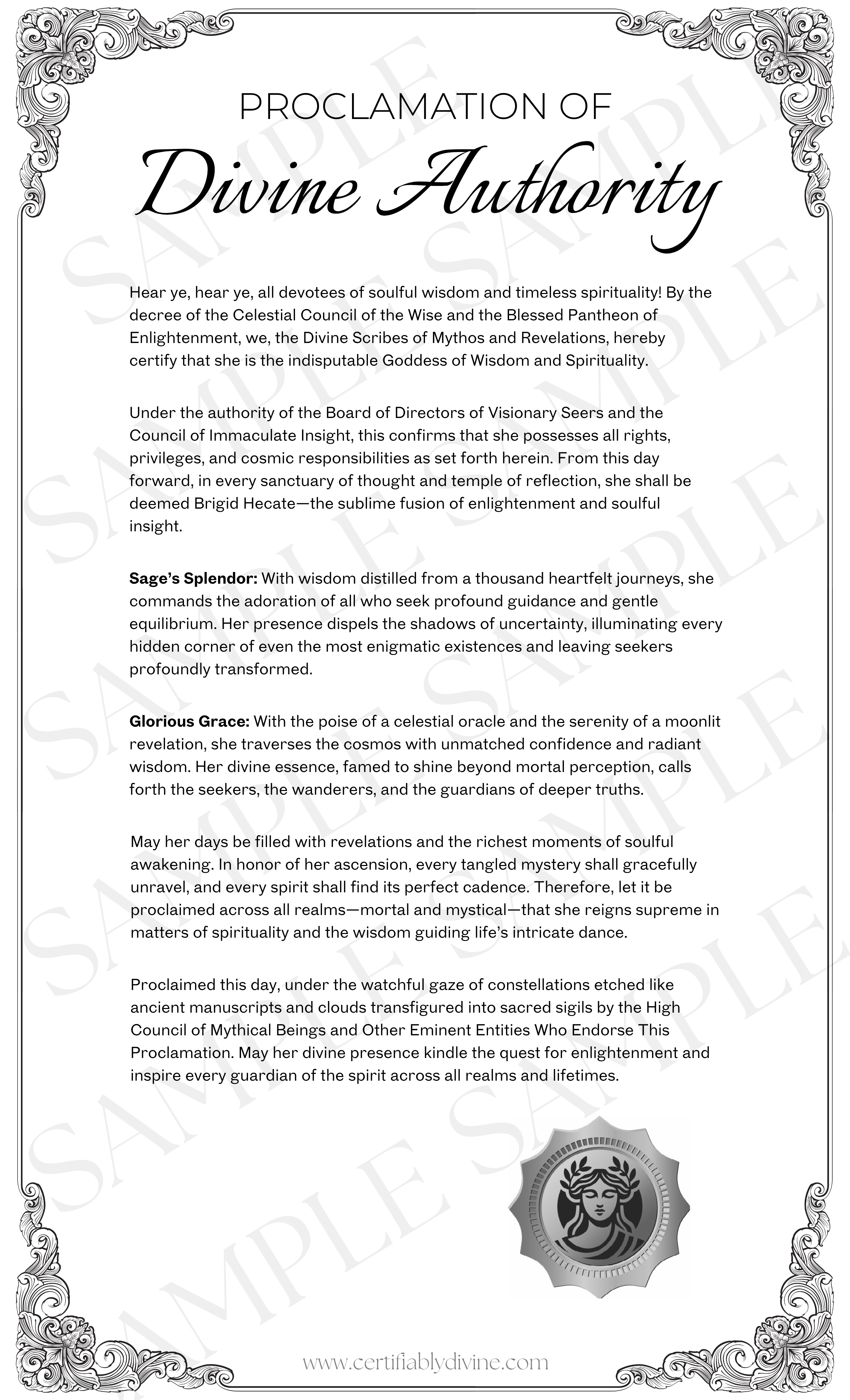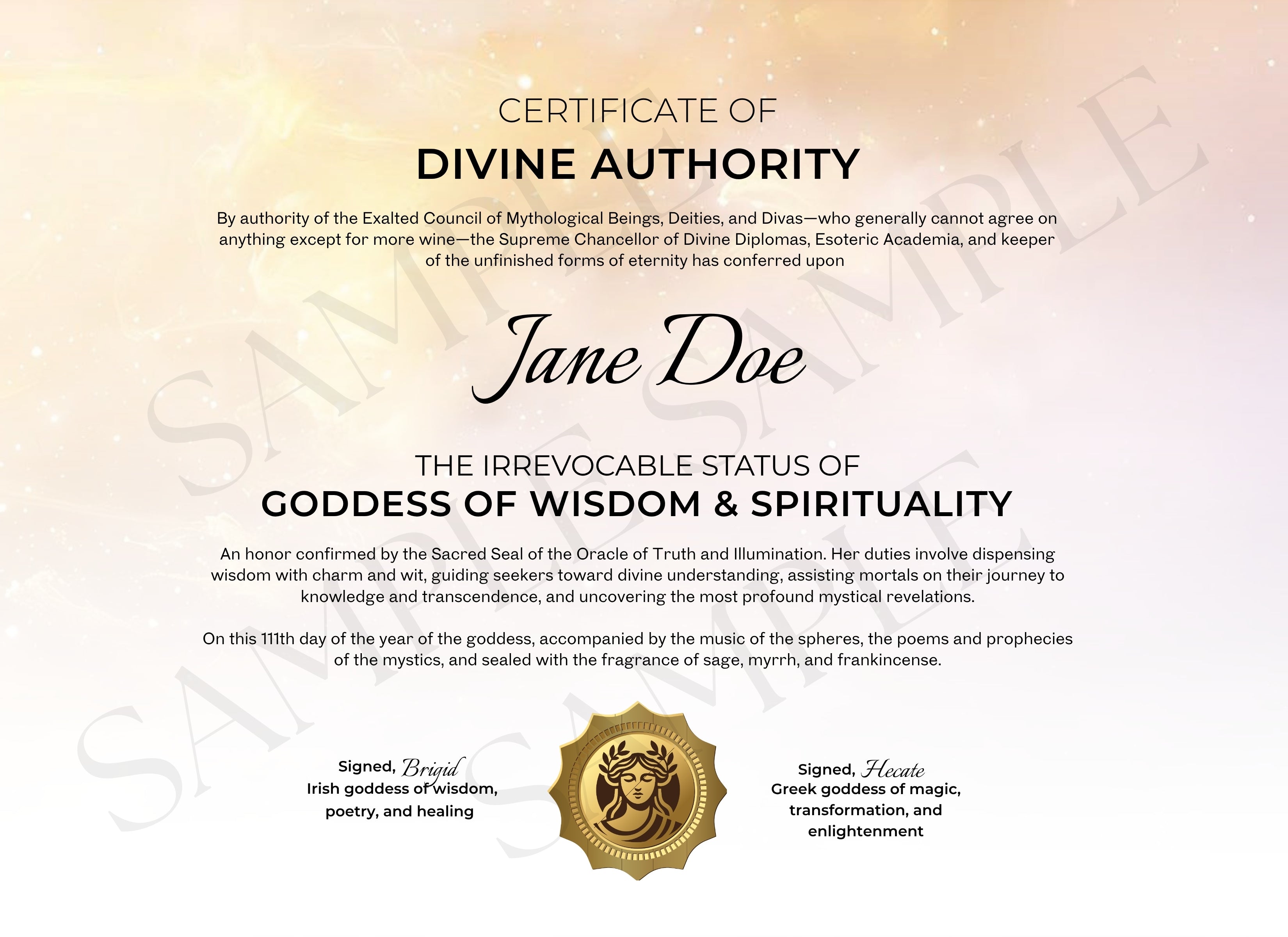 This printable certificate recognizes your journey of sacred self-discovery. You’ve mastered the art of staying grounded while reaching for the divine, sage smoke and all.