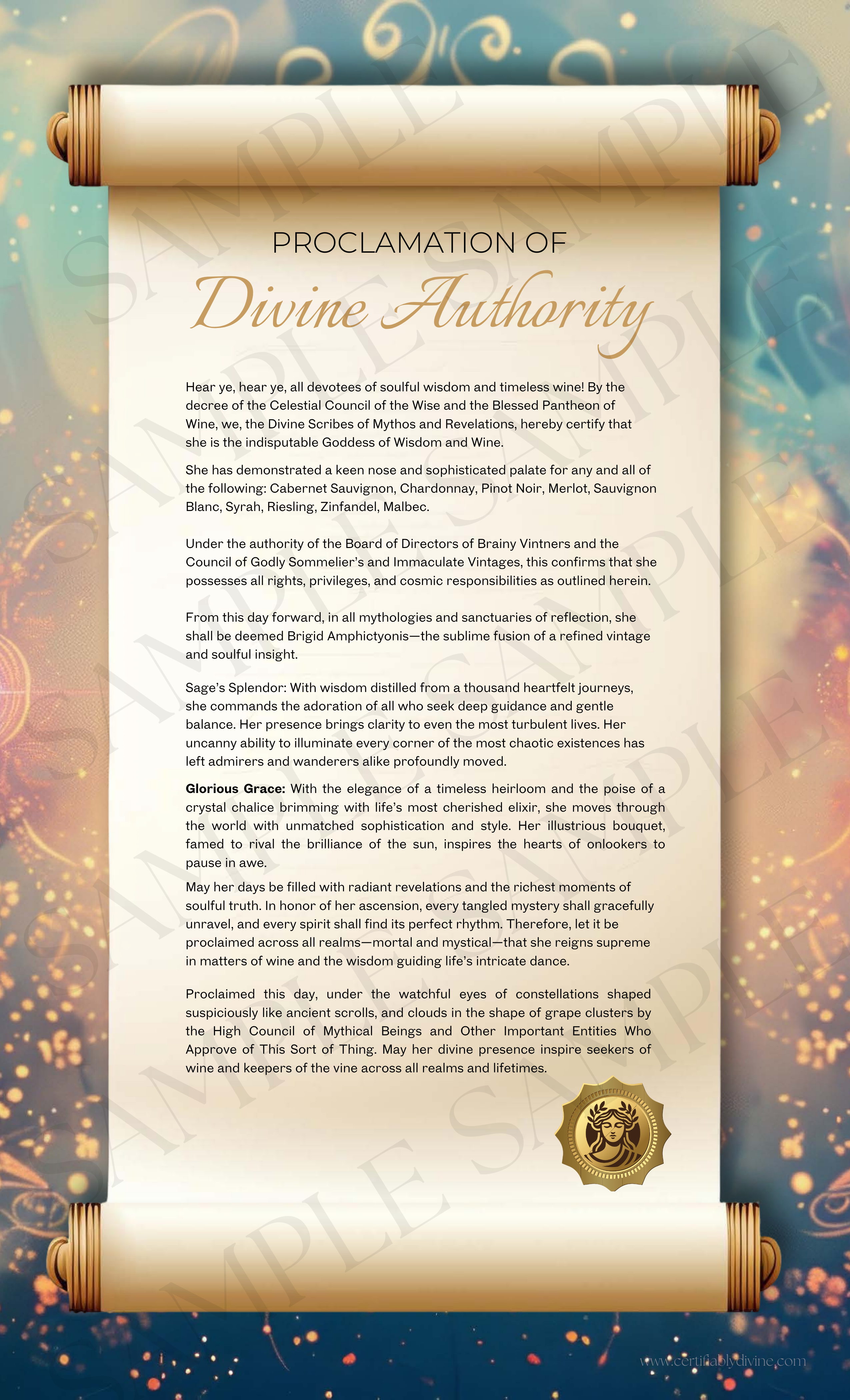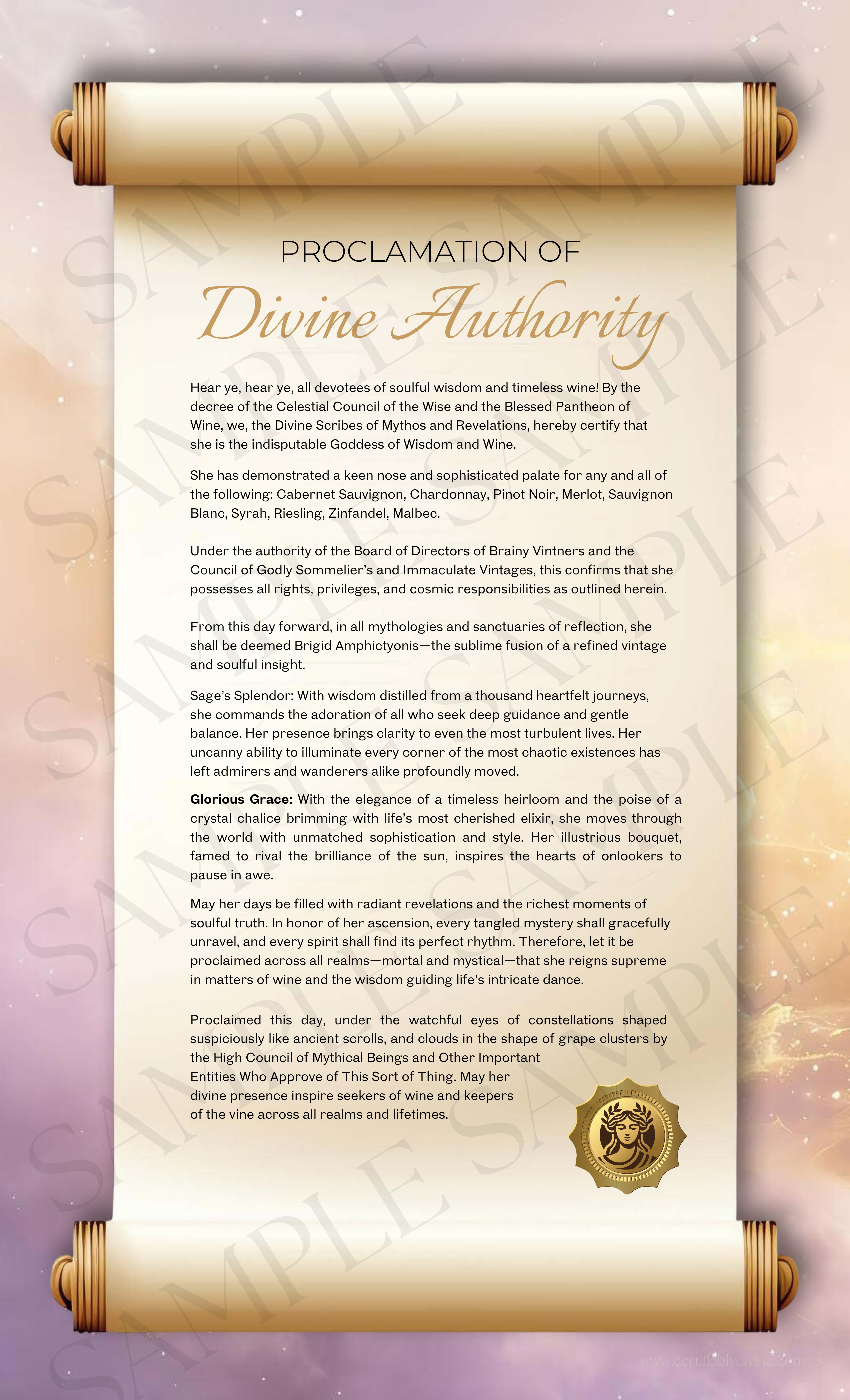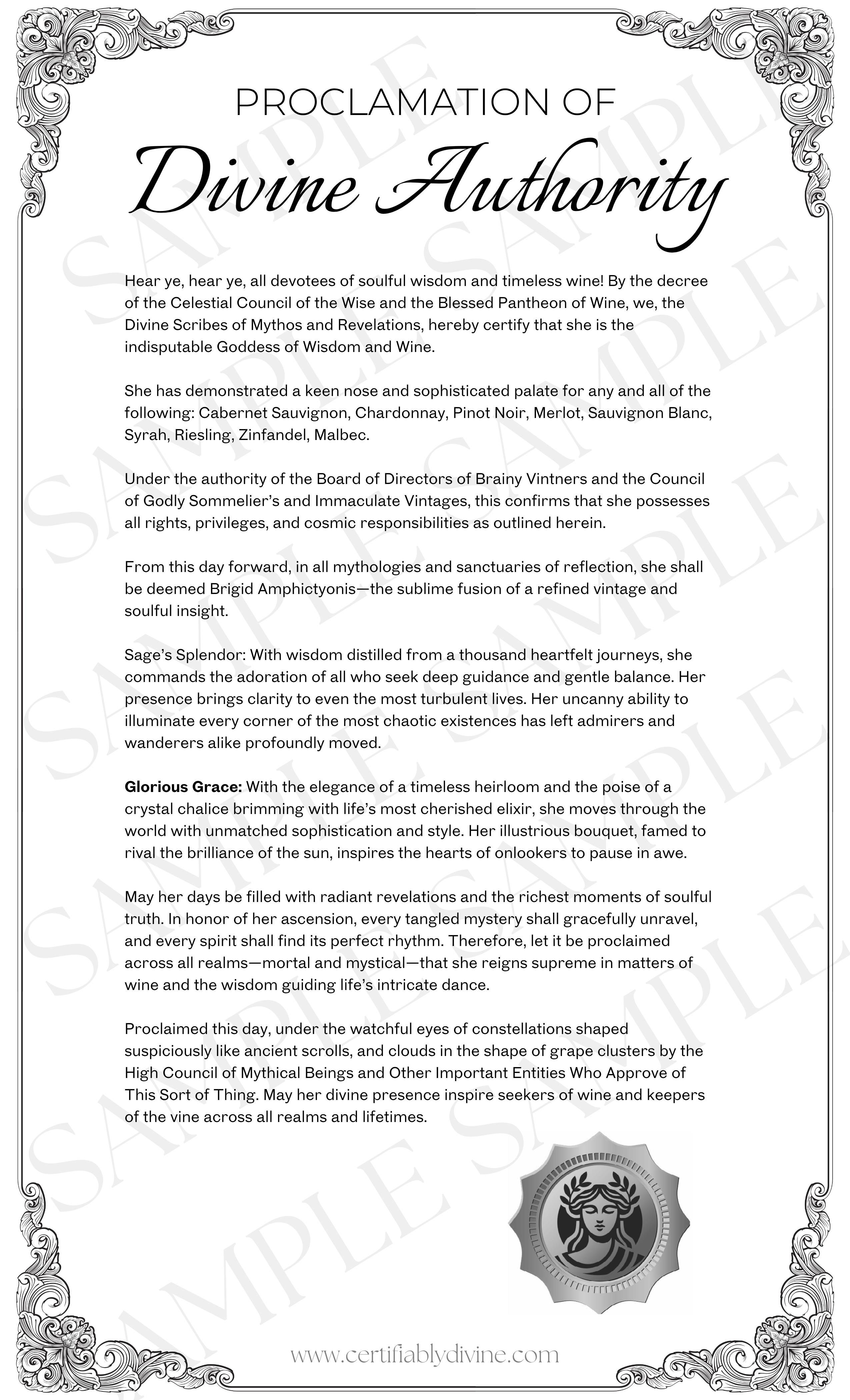 Uncork your divinity. This printable certificate celebrates the wise and wined—those who know every pour is a portal to good company, bold ideas, and unapologetic laughter.